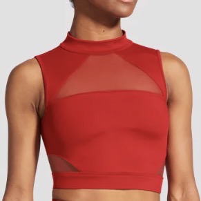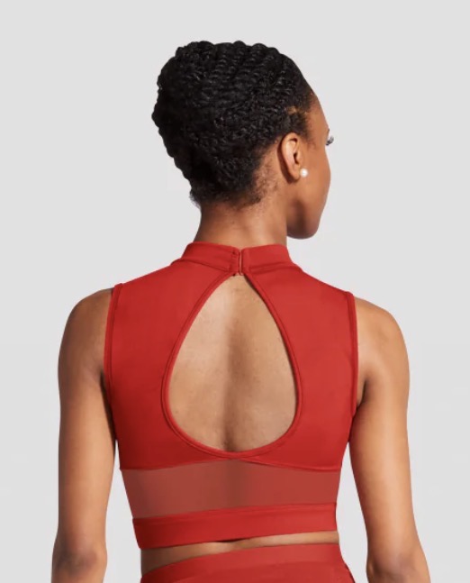 This snugly fitting crop top makes a versatile addition to your fitness and studio collection. The front of the garment features a high neckline paired with elegant soft mesh inserts and opaque tank straps. The back boasts a stylish keyhole design with a vertical soft mesh panel. A small clasp secures the piece at the nape of the neck.
