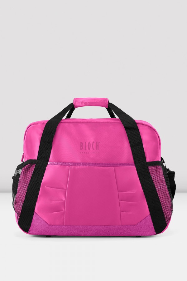 spacious main-body compartment to keep all of your core dancing needs, with multiple mesh pockets and a zipper section which is ideal for storing smaller items. Deep mesh, elasticated pockets on either end keep your drink bottle firmly in place. With dual hand-held straps for quick carry, and the option of an adjustable Bloch branded shoulder strap. Finished with faux glitter trim, a Bloch logo, and studded feet on the underside for durability. Features Hand-held straps with velcro closure Adjustable long shoulder strap Deep mesh external pockets Zipper section and multiple mesh pockets Dimensions – W45 x H31 x D18cm