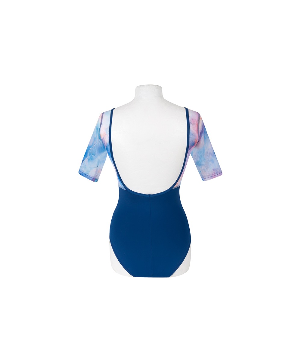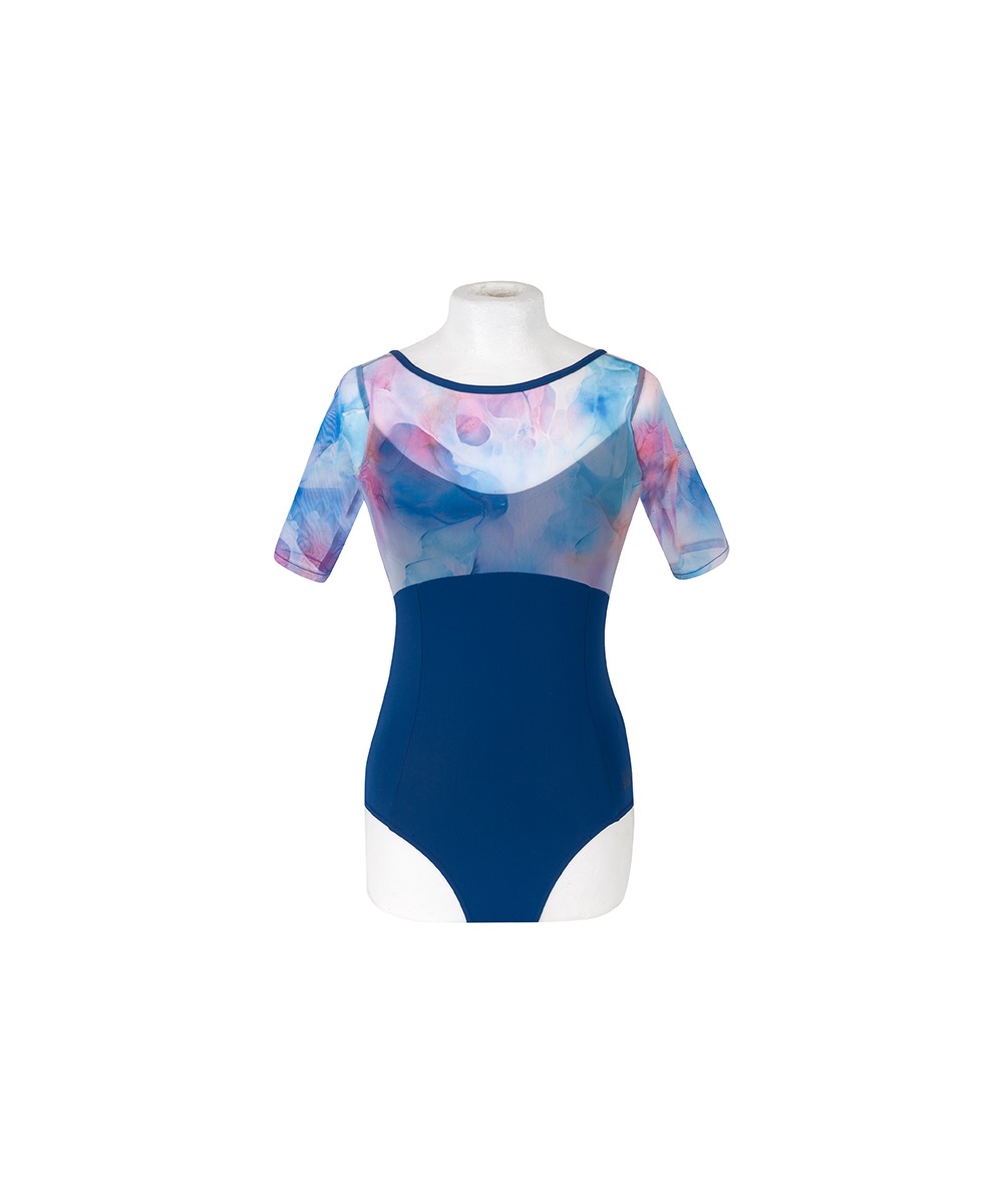Delicate half-sleeve leotard with a beautiful watercoloured overlay to the front bodice. The open rounded back created with matching coloured binding edging, makes this a truly stunning leotard. Colour Royal Blue Made with 100% sustainable Econyl fabric Made in UK