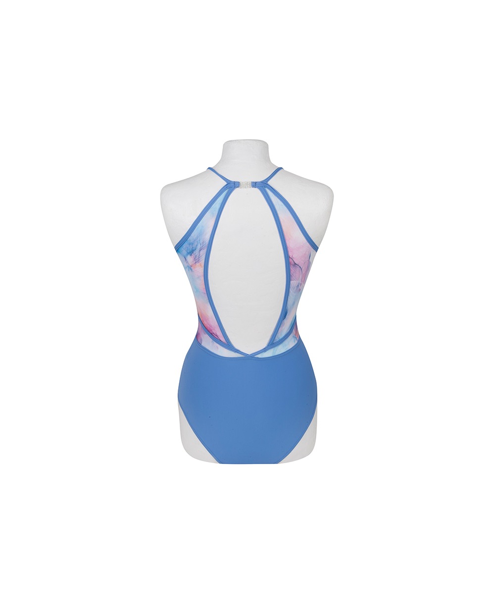 Stylish halterneck leotard with contrast binding and a unique back design. Watercoloured mesh panelling adds a delicate touch. *Powder Blue features matching binding*.