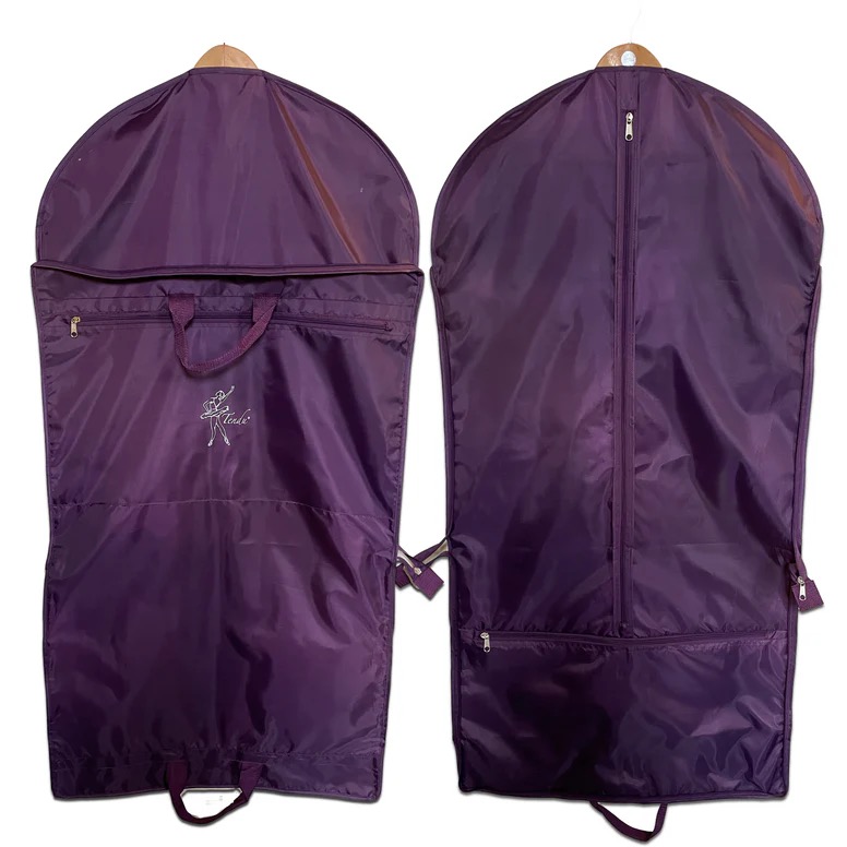 A lovely versatile bag for storing and carrying your costumes, makeup, shoes and accessories Nylon, with 3 separate zip up pockets and main section. Folds out to approx 120cm and 60 cm wide Available in aubergine only, material suitable for printing on.